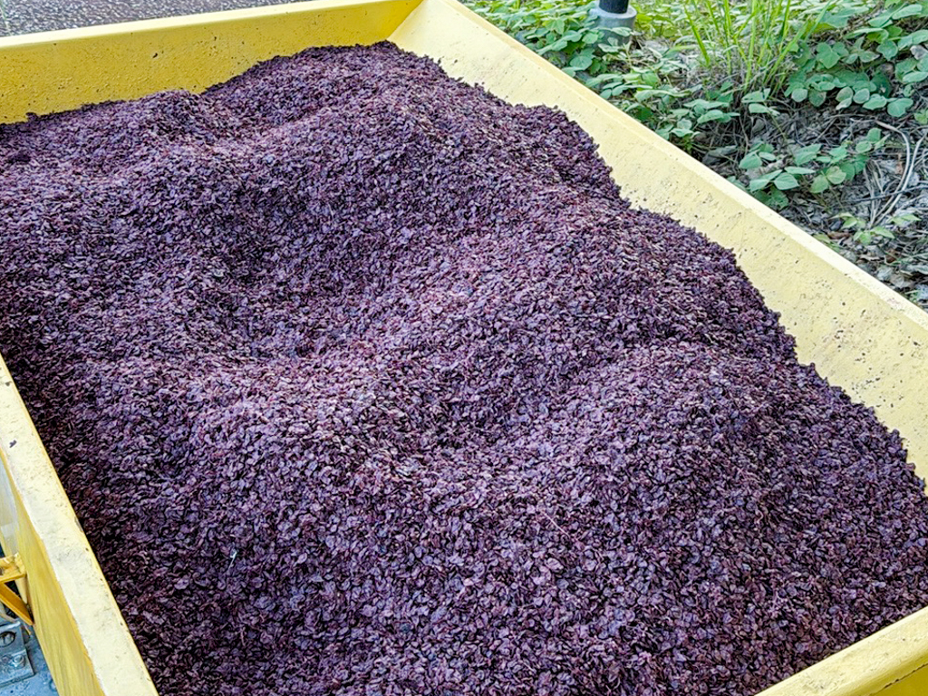 井上ワイナリーは、「無比なる価値の創出を以って世の技術発展に貢献し、お客様・社会と共に、豊かで安心な未来を築いていく」という井上石灰工業グループの理念のもと、事業をスタート。令和3年には自社醸造所が完成し、本格的なワイン製造が始まる一方で、製造工程で発生する「大量のブドウの搾りカス」という新たな課題にも直面する。